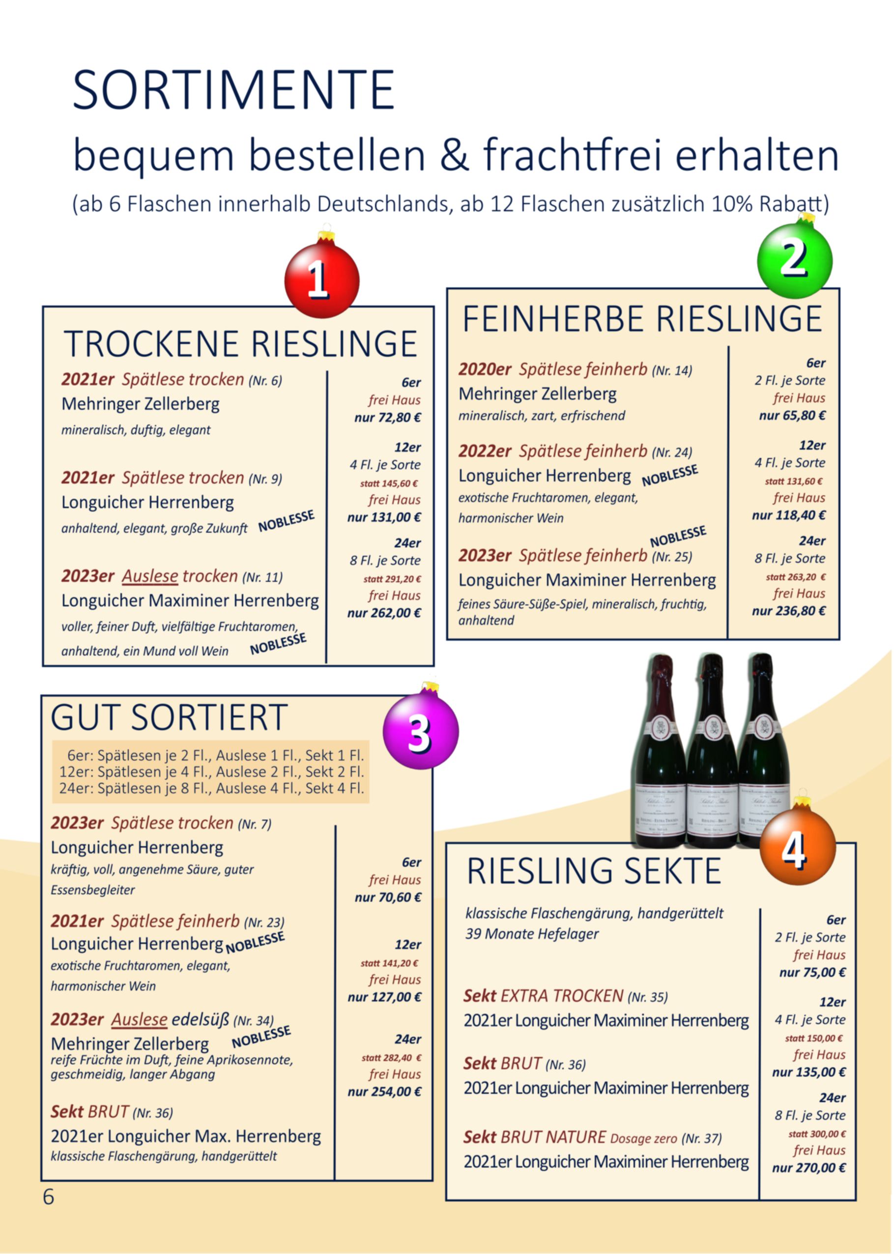 Beim Einkauf bis zum 31.12.2025 liefern wir unsere Sortimente (siehe bitte auf den Link klicken) in Deutschland ab 6 Flaschen frachtfrei und ab 12 Flaschen gewähren wir 10% Rabatt.